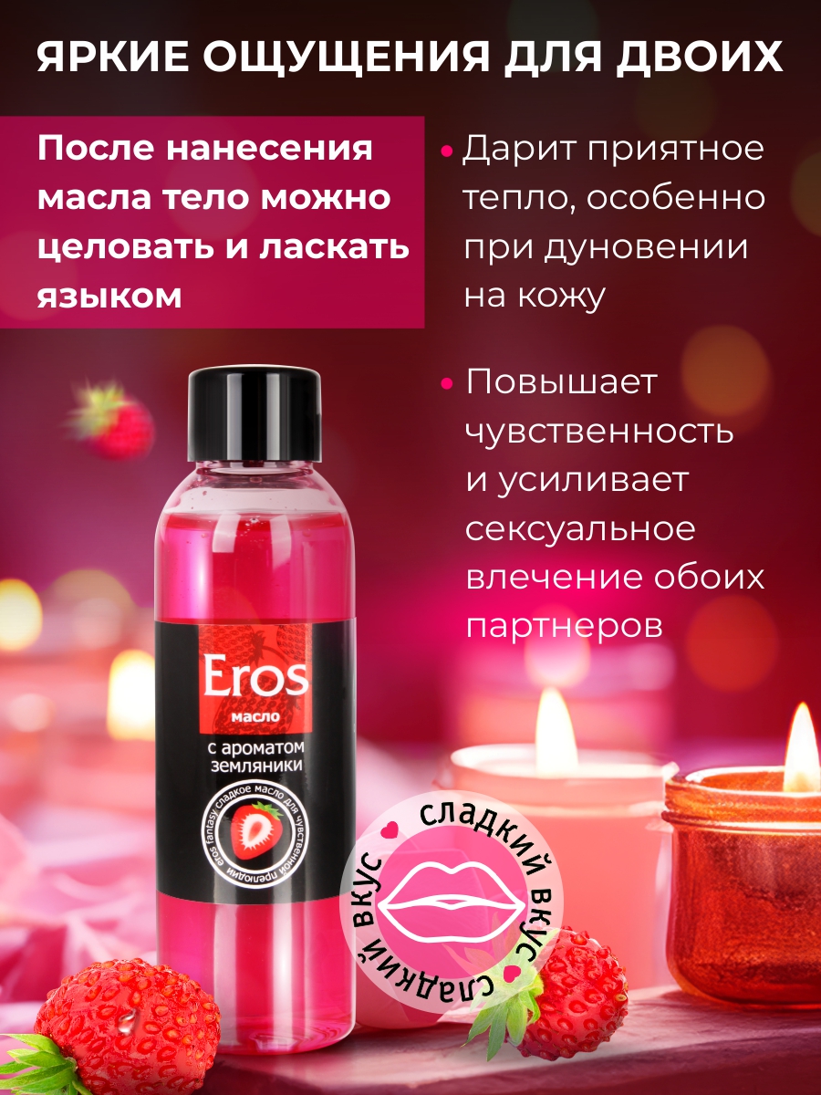 Побалуйте себя великолепным ароматом. Масло для эротического массажа «Eros fantasy» вызывает ощущение тепла, особенно при дуновении. Повышает чувствительность. Имеет приятный аромат земляники и сладкий вкус. «Eros fantasy» обеспечивают длительное скольжение. Легко смывается водой.