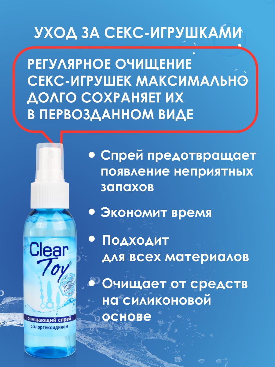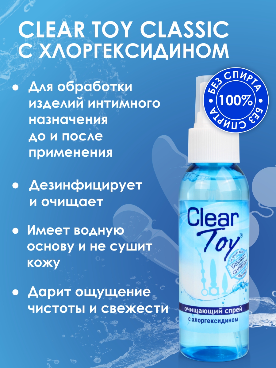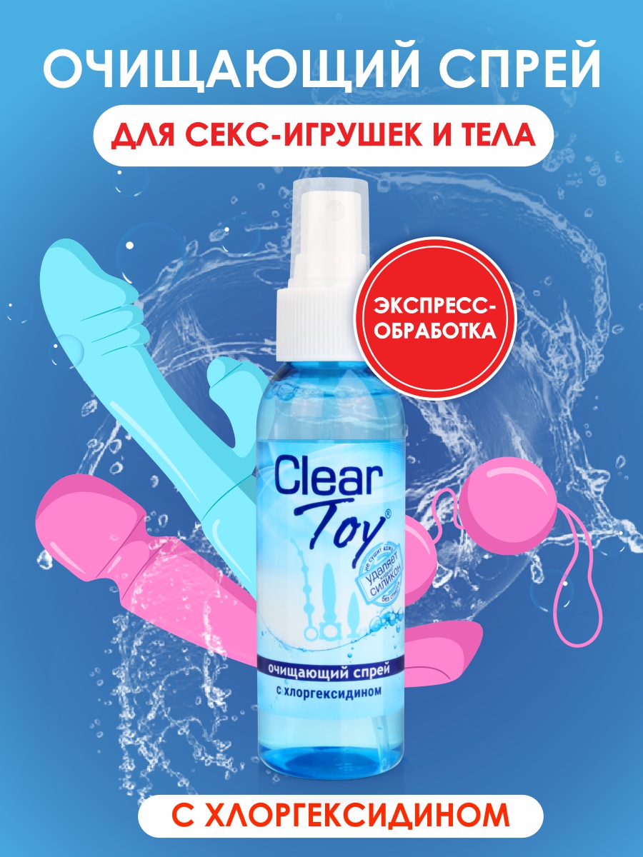 Хороший секс, в том числе с использованием интимных аксессуаров, - это невероятное удовольствие. Но не стоит забывать о гигиене. После применения поверхность секс-игрушек необходимо тщательно очистить. С помощью спрея Clear Toy это можно сделать легко и быстро. Clear Toy это:- средство нового поколения с уникальным антимикробным составом, - быстрое и эффективное очищение вашего тела и интимных аксессуаров, - ощущение чистоты и свежести после использования, - предотвращение появления неприятных запахов, - сохранение поверхности секс-игрушек, - экономия времени, - совместимость со всеми искусственными материалами. НЕ СОДЕРЖИТ СПИРТА!